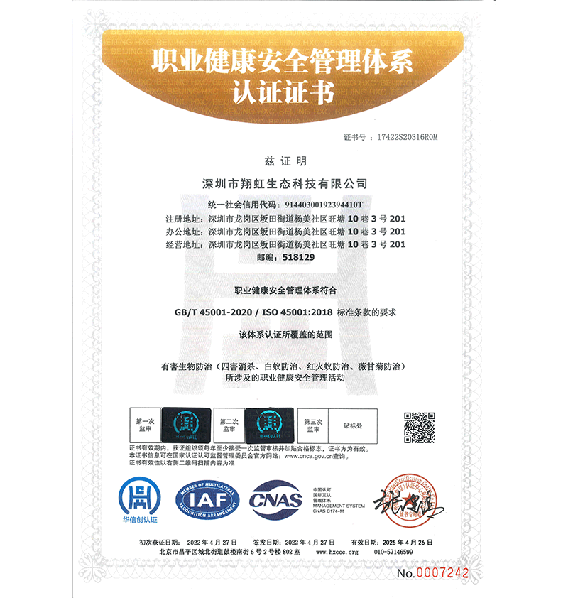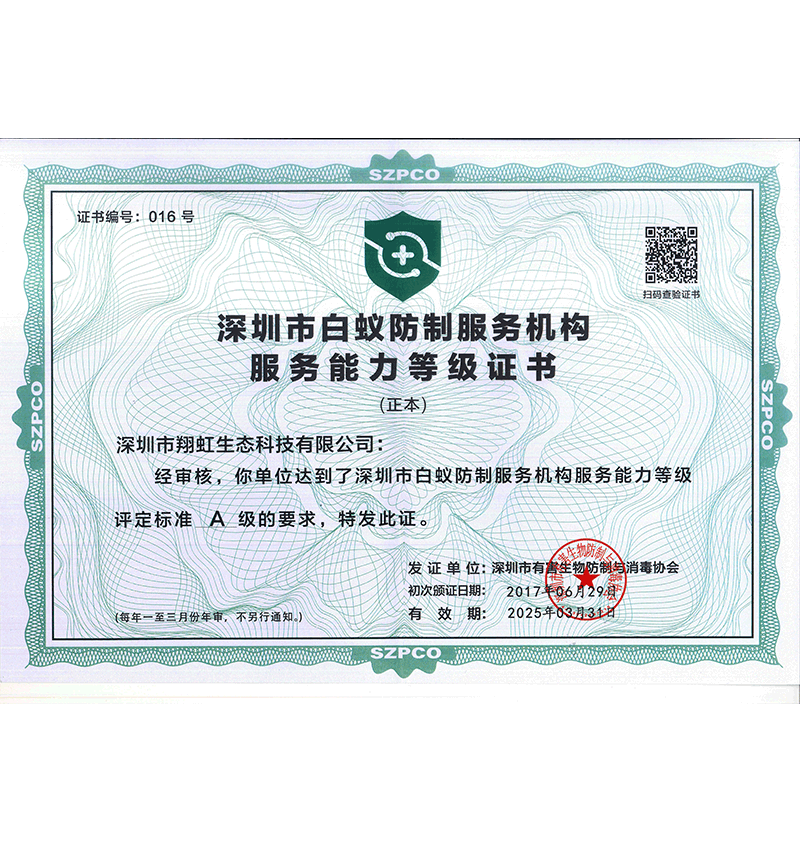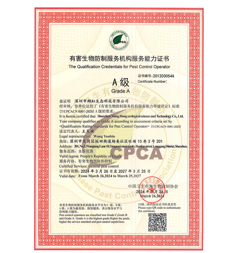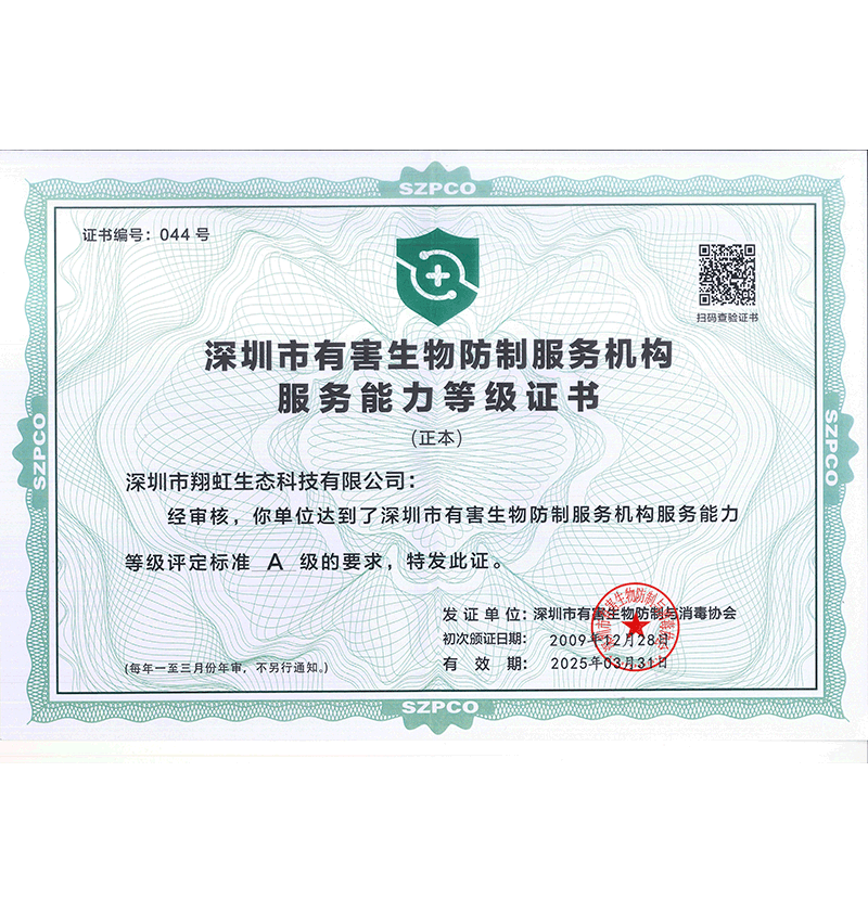 深圳市翔虹生態(tài)科技有限公司成立于1995年,是深圳最早成立的專業(yè)蟲害防治公司之一。公司發(fā)展至今獲得全國有害生物防制服務(wù)A級資質(zhì)、廣東省有害生物防制服務(wù)A級資質(zhì)、深圳市有害生物防制服務(wù)A級資質(zhì)、廣東省有害生物防制服務(wù)A級資質(zhì)、深圳市有害生物防制服務(wù)甲級資質(zhì)的單位,是中國有害生物防治協(xié)會會員、廣東省有害生物防治協(xié)會會員、深圳市有害生物防治協(xié)會理事單位,多次獲得“深圳市十佳消殺單位”榮譽(yù)。